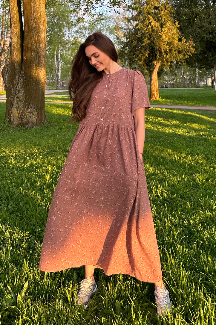 Delicate floral print dress. Composition: 100% viscose Buttons on the bar are unbuttoned, there are pockets